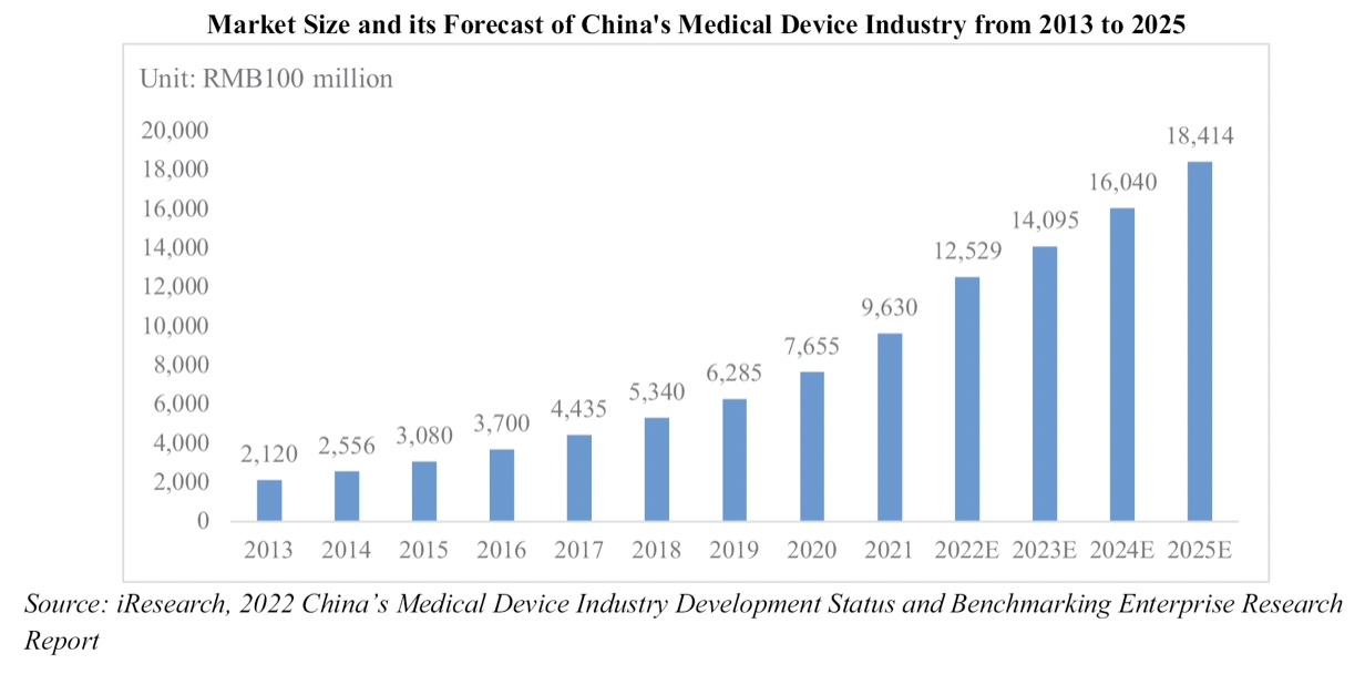 其实,随着中国政府越来越重视医疗行业的发展,不断出台鼓励创新和加快批准医疗器械应用的政策,成功带动了中国医疗器械市场的快速发展。据中国咨询公司iResearch发布的数据显示,自2013年以来,中国医疗器械行业的市场规模一直在扩大,预计2022年将达到12529亿元人民币,2025年将达到18414亿元人民币。与此同时,由于中国市场仍为新兴市场,与发达国家相比,医疗器械行业的总体增长率明显高于全球市场。