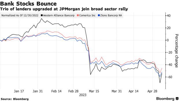 Steven Alexopoulos表示,目前,“针对美国地区性银行的负面情绪只需要稍微缓和一点,就有可能大幅调高对其评级”。他将阿莱恩斯西部银行(WAL.US)、齐昂银行(ZION.US)和联信银行(CMA.US)的股票评级上调至相当于“买入”的“增持”评级。