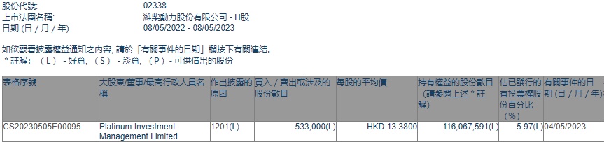 智通财经APP获悉,香港联交所最新资料显示,5月4日,Platinum Investment Management Limited减持潍柴动力(02338)53.3万股,每股作价13.38港元,总金额约为713.15万港元。减持后最新持股数目约为1.16亿股,最新持股比例为5.97%。