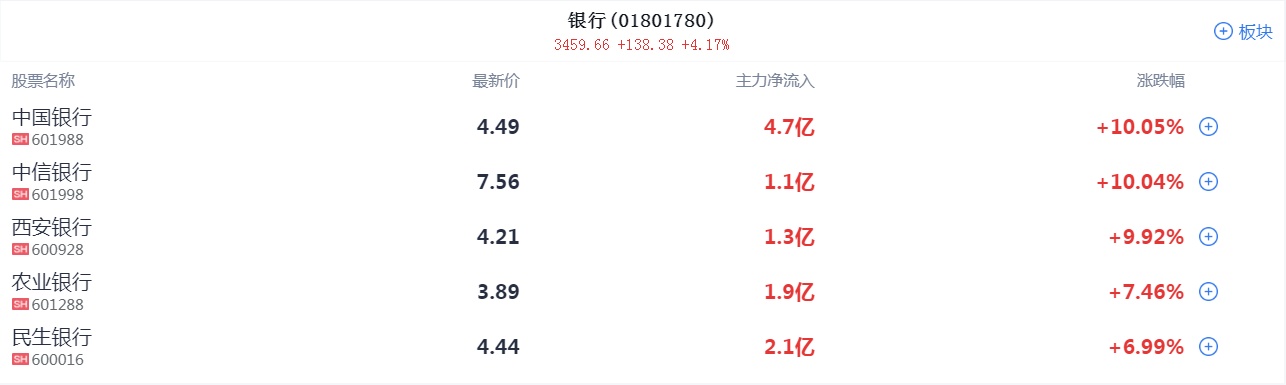 盘面上,中字头、一带一路板块掀涨停潮,秦港股份4连板,“三桶油”盘中齐创历史新高,三大运营商也携手冲高,中国移动涨超5%再创新高;银行板块爆发,四大行久违集体走高,万亿中国银行强势封涨停,为2015年7月以来首次,银行指数四天已暴涨超9%。