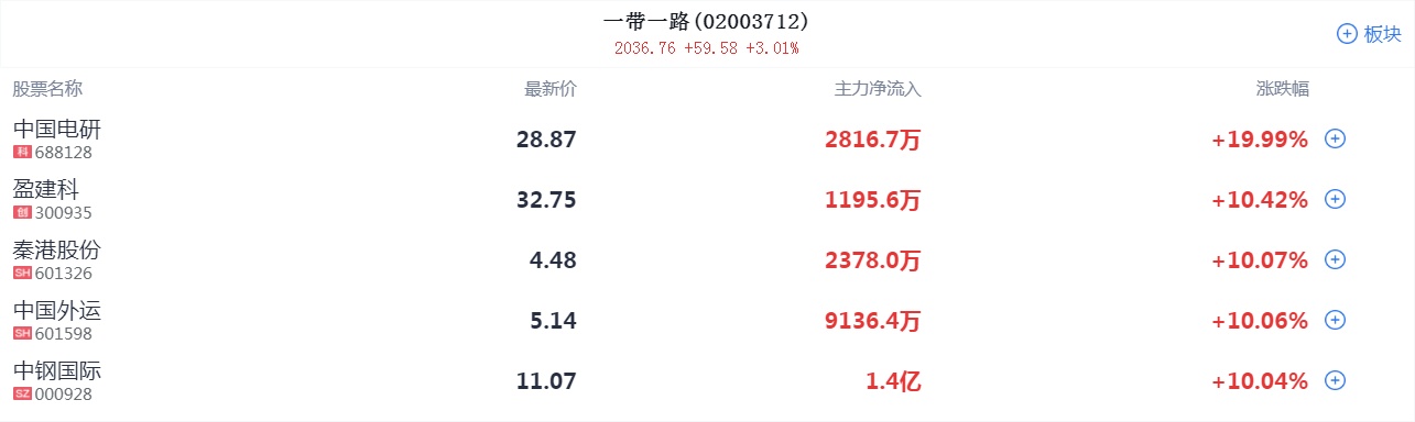 一带一路板块走强,秦港股份4连板,中国电研、中国外运、中国船舶、中国海诚等涨停,陕西建工、永贵电器、雪峰科技等冲高。