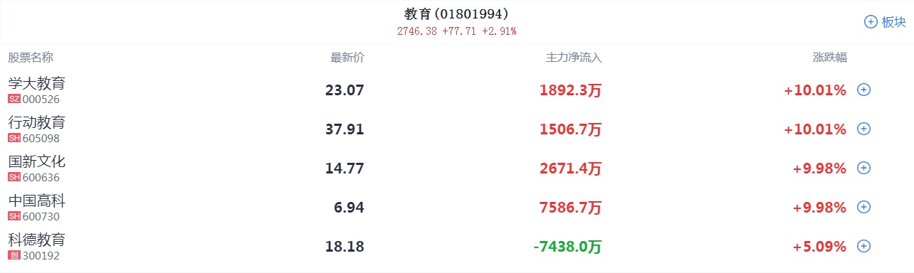 教育股集体冲高,学大教育、国新文化、中国高科等涨停,科德教育、凯文教育、传智教育等跟涨。