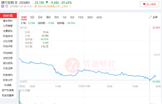 5月8日,绿竹生物如期在港股上市,但开盘即破发,股价直接低开低走,并在早盘10时45分后加速下跌,盘中跌幅一度达到24.09%至24.90港元。午盘后,公司股价继续下跌,盘中最大跌幅超过30%。