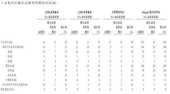 而在安全性方面,与Shingrix阳性对照组相比,低剂量及高剂量LZ901组观察到的AE频率和严重程度均远远较低。