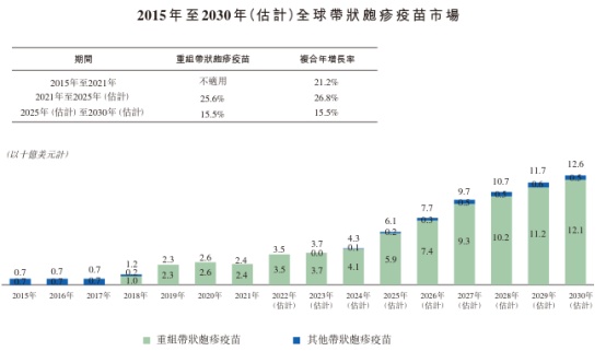 根据弗若斯特沙利文资料,按销售收入计,中国带状疱疹疫苗市场从2015年的零增加至2025年的108亿元,预计2021年至2025年的复合年增长率为103.8%,到2030年将达到281亿元的市场空间。中国市场目前只有GSK和百克生物的疫苗已获批。百克生物的感维虽是减毒活疫苗,但凭借国产首发进度优势获得了不小市场。