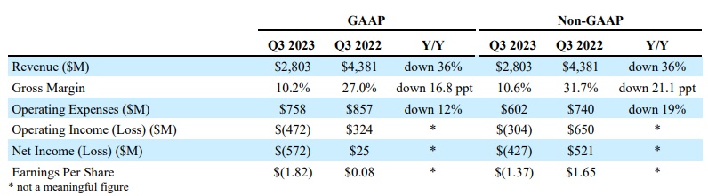 智通财经APP获悉,周一美股盘后,西部数据(WDC.US)公布了2023财年第三财季财报。财报显示,在GAAP会计准则下,西部数据Q3营收为28.03亿美元,好于市场预期的27.0亿美元,上年同期为43.81亿美元,同比下降36%。净亏损为5.72亿美元,上年同期净利润为2500万美元;每股亏损为1.82美元,上年同期每股收益为0.08美元。调整后的每股亏损为1.37美元,低于市场预期的每股亏损1.57美元。