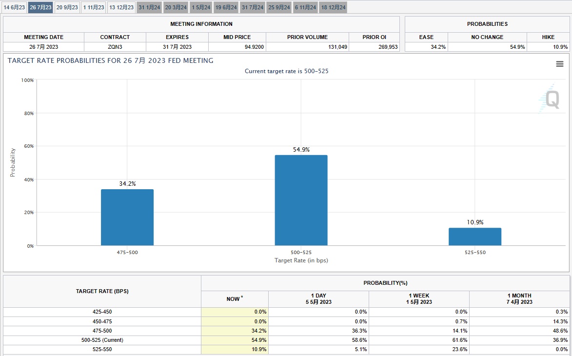 智通财经APP获悉,五月的加息才刚刚落幕,市场已开始押注美联储将于七月开启降息周期。根据芝商所美联储观察工具显示,7月降息25个基点的概率为34.2%,而一周前为14.1%。此外,参考美联储会议日期的掉期合约价格继续显示,市场预期美联储到年底将降息约70个基点。不过,高盛和巴克莱的策略师提醒投资者称,目前市场对此过分自信,不要对美联储今年降息抱有希望。