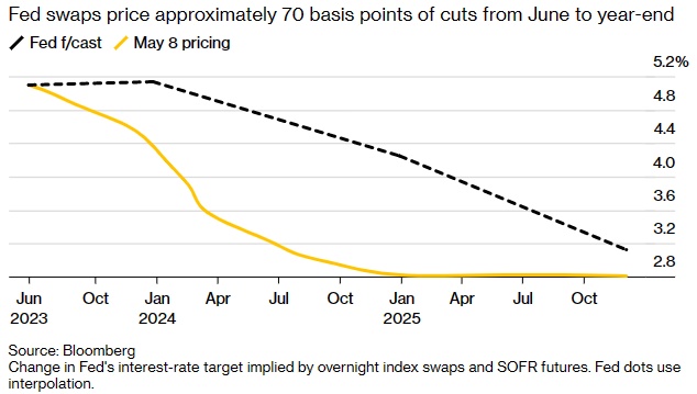 以Praveen Korapaty为首的高盛策略师表示,从历史上看,当美联储进行了一系列加息之后,通常会有两次会议决定不再有任何利率变动,未来六个月最有可能的结果是“美联储按兵不动”。但这样的看法和目前市场押注的今年的宽松程度不符。上周,巴克莱的策略师建议客户,在95.06价位做空8月美国联邦基金利率期货,他们预计今年内大幅降息的定价预期会消退。