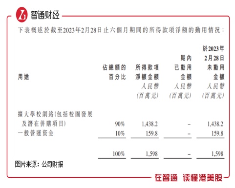 根据该公司中期财报披露,公司于2023年1月完成配售融资,经扣除相关成本、专业费用及实付费用后,所得款项净额约16亿港元,约有14.4亿港元,占比90%用作扩大校网络,包括校园发展及潜在并购项目。该公司上次募资是2021年2月,融资20.13亿港元,主要用于建设新校区,目前仅剩下0.93亿港元可用。