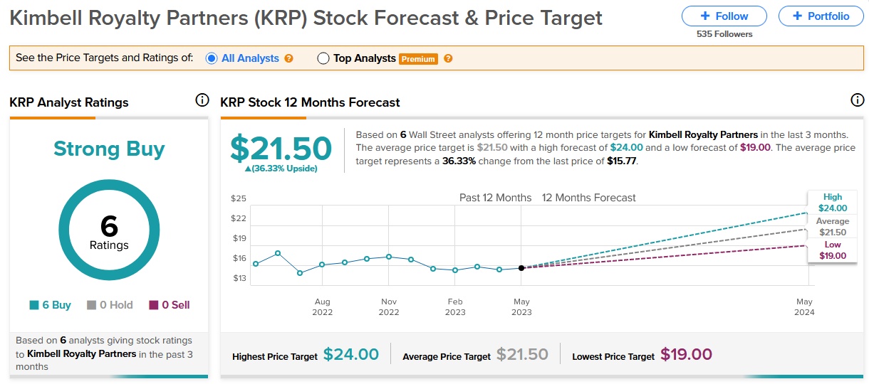 展望未来,RBC Capital分析师TJ Schultz给予Kimbell Royalty Partners“跑赢大盘(即买入)”评级,目标价为24美元,较当前股价有52%的上涨空间。此外,华尔街分析师们对该股的共识评级为“强烈买入”,目标价为21.5美元,较当前股价有36%的上涨空间。