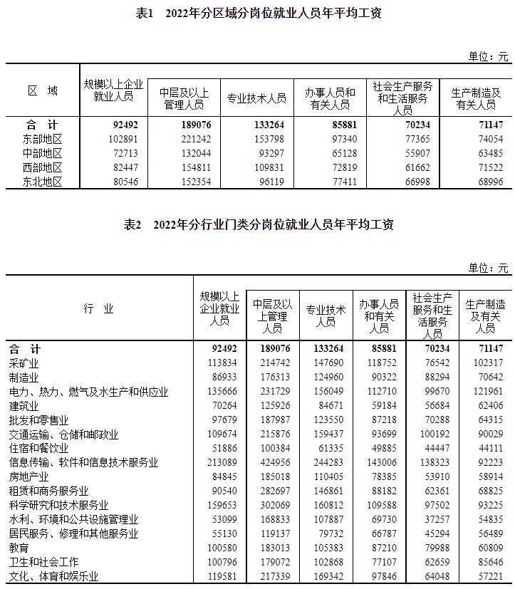 智通财经APP获悉,5月9日,国家统计局公布2022年全国规模以上企业就业人员年平均工资以及2022年全国城镇非私营单位就业人员年平均工资数据。2022年全国规模以上企业就业人员年平均工资为92492元,比上年名义增长5.0%。其中,中层及以上管理人员189076元,增长4.7%;专业技术人员133264元,增长6.6%;办事人员和有关人员85881元,增长4.1%;社会生产服务和生活服务人员70234元,增长3.3%;生产制造及有关人员71147元,增长3.9%。