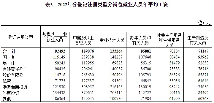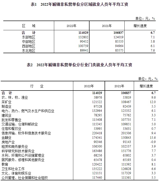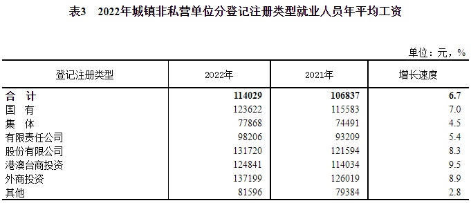 2022年全国城镇非私营单位就业人员年平均工资为114029元,比上年增加7192元,名义增长6.7%。扣除价格因素,2022年全国城镇非私营单位就业人员年平均工资实际增长4.6%。