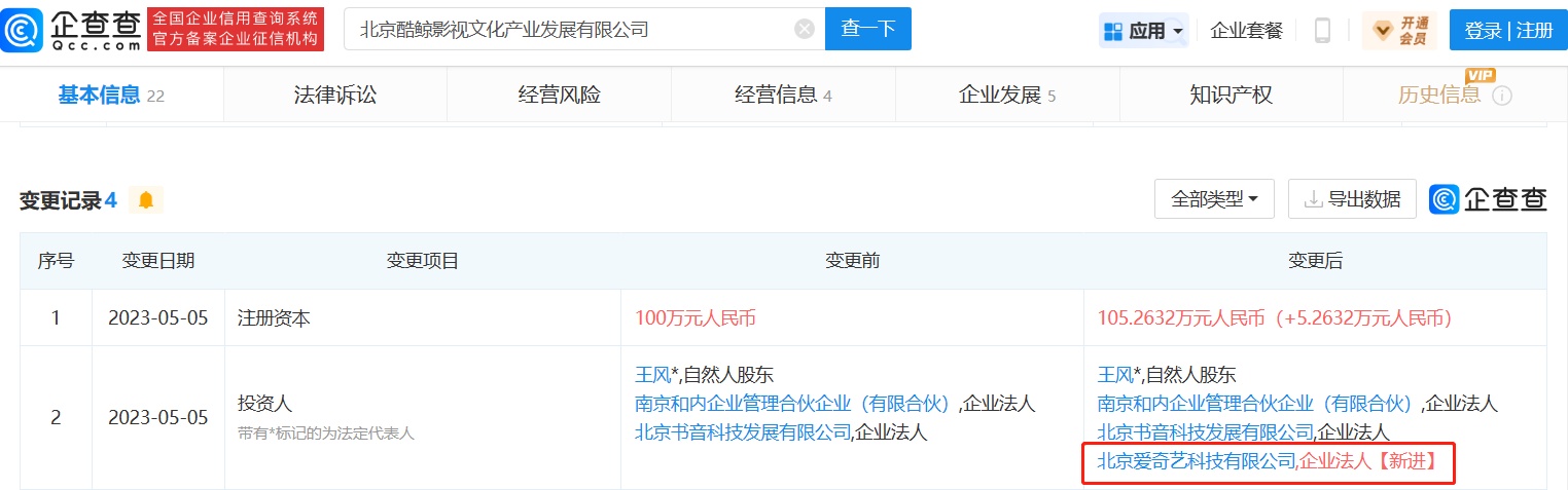 智通财经APP获悉,企查查APP显示,近日,北京酷鲸影视文化产业发展有限公司(下称:酷鲸影视)发生工商变更,新增北京爱奇艺科技有限公司为股东;同时,注册资本由100万人民币增至约105.26万人民币。