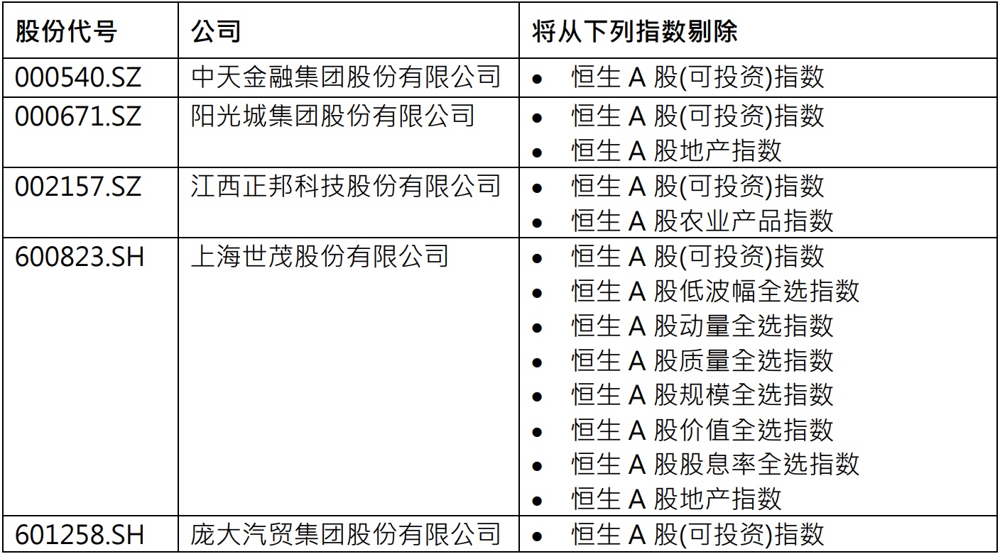智通财经APP获悉,5月9日,恒生指数系列成份股发生变动。具体来看,由于*ST中天(000540.SZ)、ST阳光城(000671.SZ)、*ST 正邦(002157.SZ)、ST世茂(600823.SH)、*ST庞大(601258.SH)等五家公司已被列为“ST/*ST 股票”,故不再符合纳入相关指数系列的标准。因此,于2023年5月19日(星期五)收市后,上述指数将有成份股变动,有关变动将于2023年5月22日(星期一)生效。
