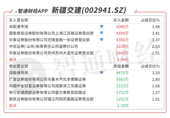 新疆交建(002941.SZ):多主力现身龙虎榜,深股通大单对倒净买入610万元,买二是顶级游资章盟主的席位买入4339万元,买三是知名游资苏南帮的席位买入4284万元,当日净买入6338万元,该股今日突破所有均线创新高,预计有溢价。