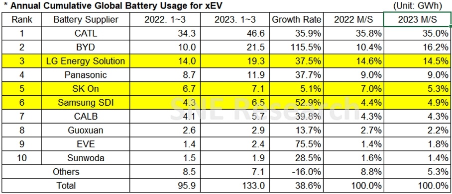 K-trio公司的综合市场份额为24.7%,与去年同期相比下降了1.3%,但总体看都呈上升趋势。LG能源排名第三,实现了37.5%的同比增长;SK On以5.1%的增长率排名第五,而三星SDI以52.9%的增长率位居榜单第六。