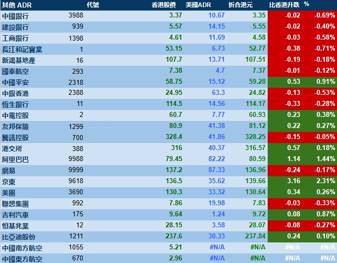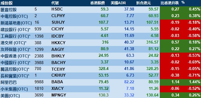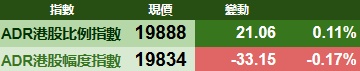 智通财经APP获悉,周二,美股三大指数集体收跌,港股ADR指数上涨,按比例计算,收报19888点,较香港收市上涨21.06点或0.11%。