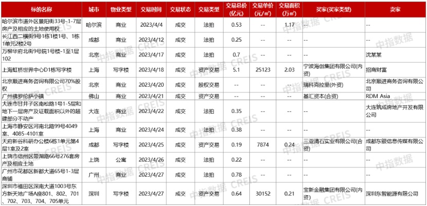 注:本表仅列示4月监测案例,物业类型不含工业、住宅、地块,此外不含关联交易、不含为发行REITs或类REITs产品产生的交易,不含交易总价在2000万元以内的法拍。