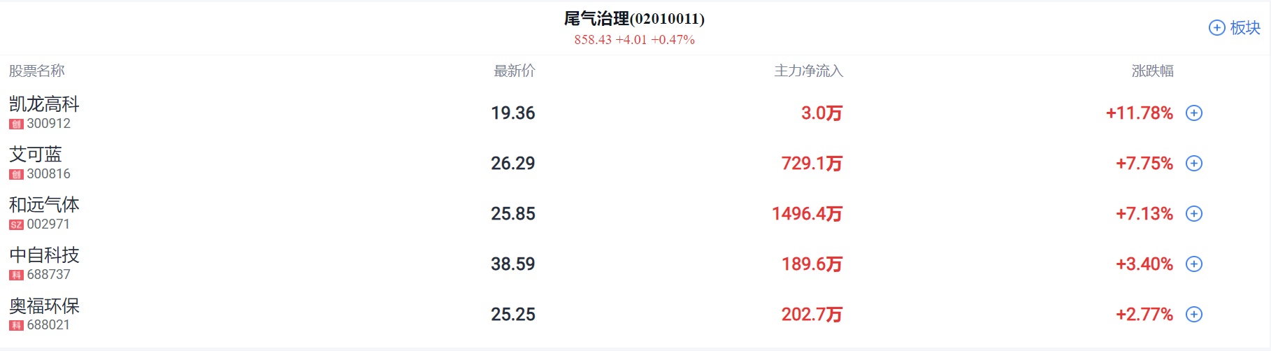 尾气治理板块走强,凯龙高科、艾可蓝大涨超10%,奥福环保、皖仪科技、四方光电等跟涨。