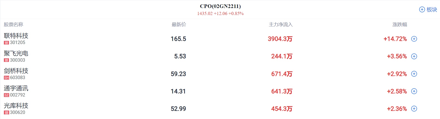 CPO概念震荡冲高,联特科技涨超10%,震有科技、新易盛、天孚通信、剑桥科技等跟涨。