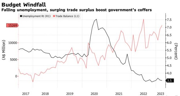 澳大利亚即将实现自2008年以来的首次预算盈余,因为意外税收收入和商品出口价格上涨共同使政府的收入膨胀。查默斯预计在截至2023年6月的财年内将出现约42亿澳元(28亿美元)的财政盈余。