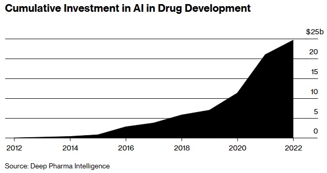 研究公司Deep Pharma Intelligence预估,在过去四年中,对人工智能驱动的药物研发公司的投资增长了两倍,到2022年达到246亿美元。去年1月,赛诺菲(SNY.US)同意向总部位于英国的Exscientia Plc预付1亿美元,再加上可能高达52亿美元的里程碑付款,用于研究新药,并利用人工智能系统开发多达15种肿瘤学和免疫学候选药物。
