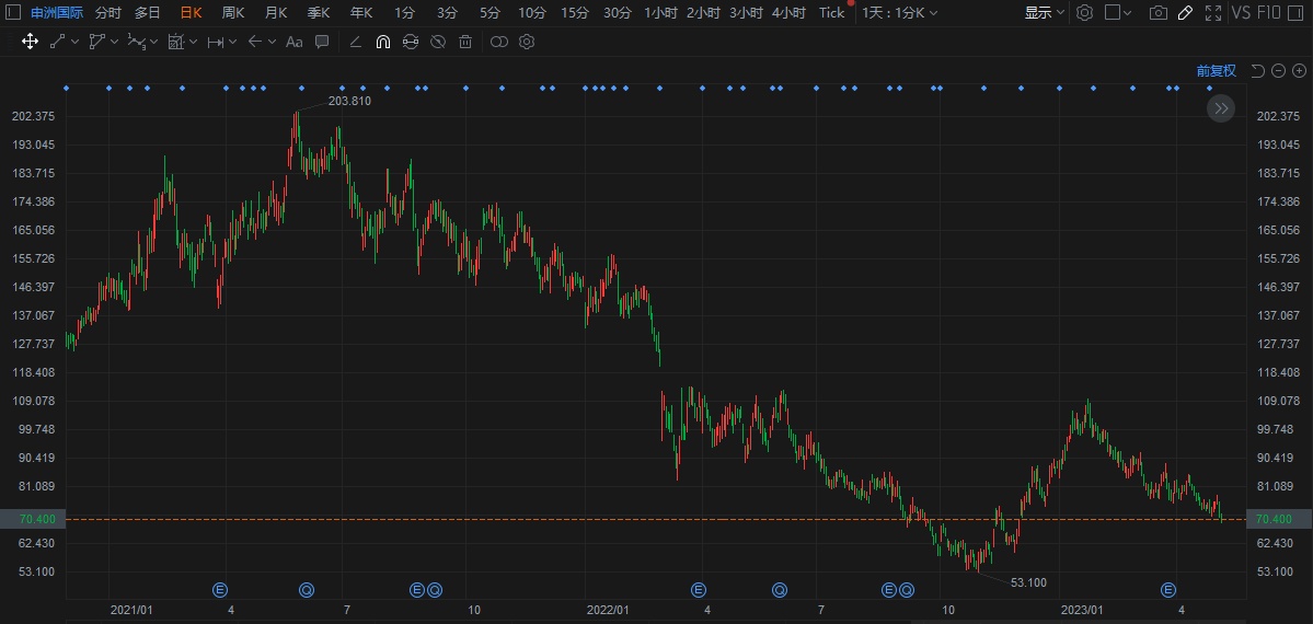 智通财经APP获悉,5月10日,"运动服装品牌代工厂龙头"申洲国际(02313)一度跌近3%,最低价69.5港元,创1个月新低。值得注意的是,自2021年5月达到203港元的高点,在过去两年力,公司股价最低跌至53港元附近,市值缩水约四分之三。在今年1月份股价曾反弹至110港元附近,自此后继续一路下跌至如今的70港元。