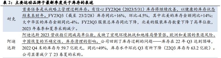 尽管全球环境仍有不确定性,但以耐克为首的运动客户去库存已取得积极进展。根据国元国际研报,耐克2023年第三季度库存环比下降4.5%,而阿迪2022第四季度末的库存环比也有所下降。