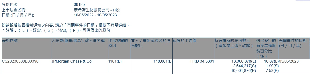 智通财经APP获悉,香港联交所最新资料显示,5月3日,小摩增持康希诺生物(06185)14.8861万股,每股作价34.3301港元,总金额约为511.04万港元。增持后最新持股数目约为1336.01万股,最新持股比例为10.07%。