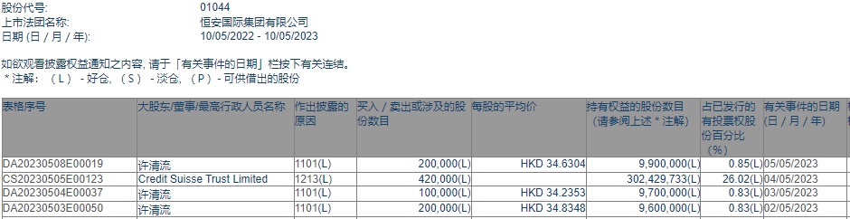 智通财经APP获悉,香港联交所最新资料显示,5月2、3、5日,公司行政总裁兼执行董事许清流分别增持恒安国际(01044)20万股、10万股、20万股,合计50万股;每股作价分别为34.8348港元、34.2353港元、34.6304港元;总金额约为1731.66万港元。增持后最新持股数目为990万股,最新持股比例为0.85%。