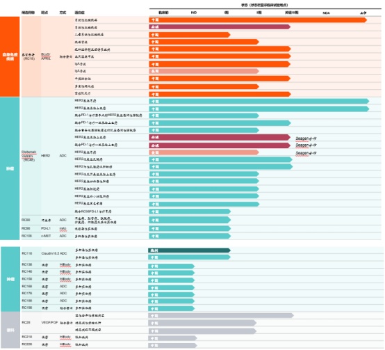 公司目前ADC管线共有七个产品临床开发阶段。其中,RC28布局眼科,湿性老年黄斑变性(wAMD)处于III期临床,糖尿病黄斑水肿(DME)、糖尿病视网膜病变(DR)处于二期;RC88(间皮素MSLN-ADC)已完成一期患者招募,目前正在数据清理阶段及患者拓展阶段;RC108(c-MET靶向ADC)一期患者招募中;RC118(Claudin 18.2 ADC)澳洲一期临床已完成三个剂量组的爬坡,中国一期招募中,获FDA授予的孤儿药资格。