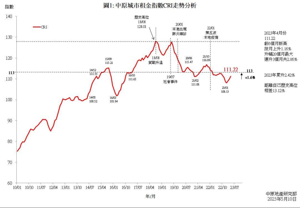 智通财经APP获悉,5月10日,中原地产研究部高级联席董事杨明仪指出,4月份中原城市租金指数CRI最新报111.22点,环比升1.16%,指数创6个月新高,重返2022年10月水平。租金升势持续扩大,4月升1.16%,升幅为近20个月最大,3月升0.92%,2月升0.76%。