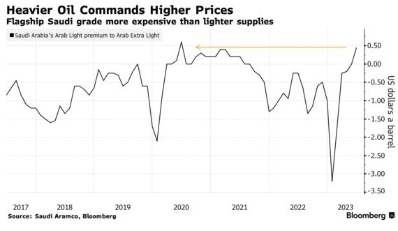 智通财经APP注意到,亚洲和欧洲的石油买家不得不为质量较低、污染较重的原油支付高昂的价格,因为对俄罗斯的制裁和欧佩克+减产减少了这些等级原油的供应。