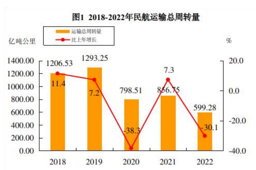 2022年,全行业完成运输总周转量599.28亿吨公里,比上年下降30.1%。国内航线完成运输总周转量387.86亿吨公里,比上年下降39.5%,其中,港澳台航线完成2.30亿吨公里,比上年下降23.6%;国际航线完成运输总周转量211.42亿吨公里,比上年下降1.9%。