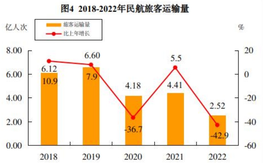 2022年,全行业完成旅客运输量25171.32万人次,比上年下降42.9%。国内航线完成旅客运输量24985.25万人次,比上年下降43.1%,其中,港澳台航线完成46.92万人次,比上年下降20.8%;国际航线完成旅客运输量186.08万人次,比上年增长26.0%。