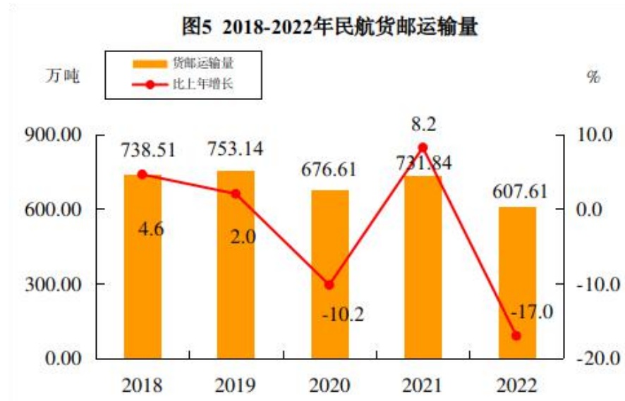 2022年,全行业完成货邮运输量607.61万吨,比上年下降17.0%。国内航线完成货邮运输量343.79万吨,比上年下降26.1%,其中,港澳台航线完成14.74万吨,比上年下降22.4%;国际航线完成货邮运输量263.82万吨,比上年下降1.1%。