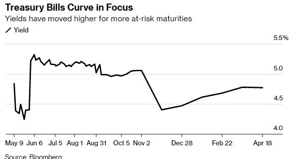 投资者历来要求在美国借贷能力耗尽后不久,或者即将耗尽时偿还的美债获取更高的收益率。这让人们非常关注美债的收益率曲线——那就是最短期限的国债——以及由此出现的潜在混乱。曲线特定部分明显的向上扭曲往往表明投资者越来越担心,此时美国政府可能面临违约风险,而现在这一担忧情绪在6月初左右最为突出。周一,美国政府以5.14%的收益率出售了570亿美元的三个月期美债,这些债券定于8月10日到期。这是自2001年1月以来该基准债券的最高拍卖收益率。
