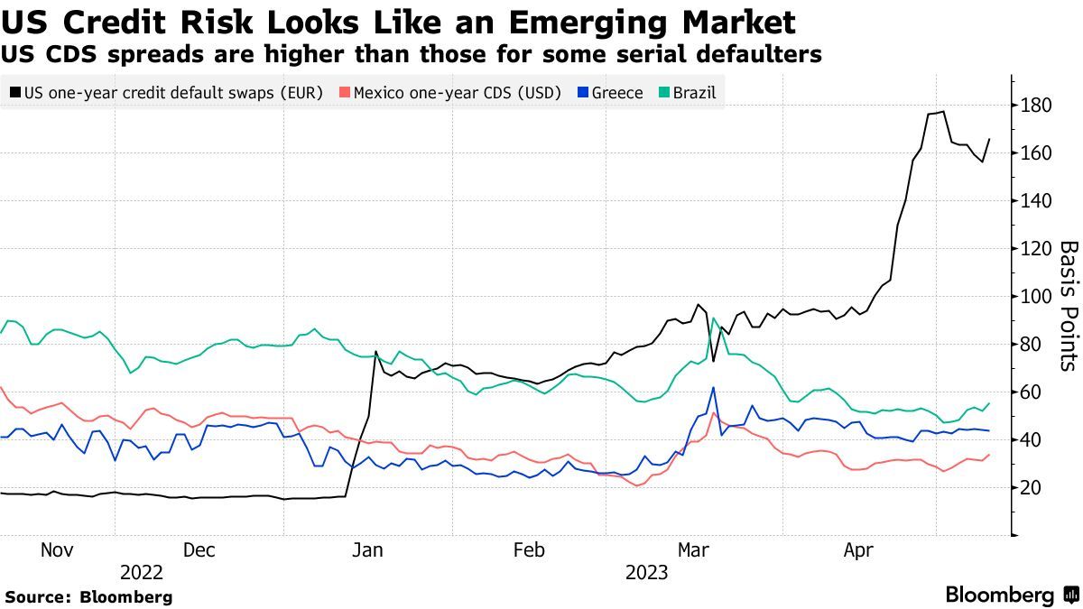 美国信用风险看起来像新兴市场——美国CDS利差高于一些连续违约的国家
