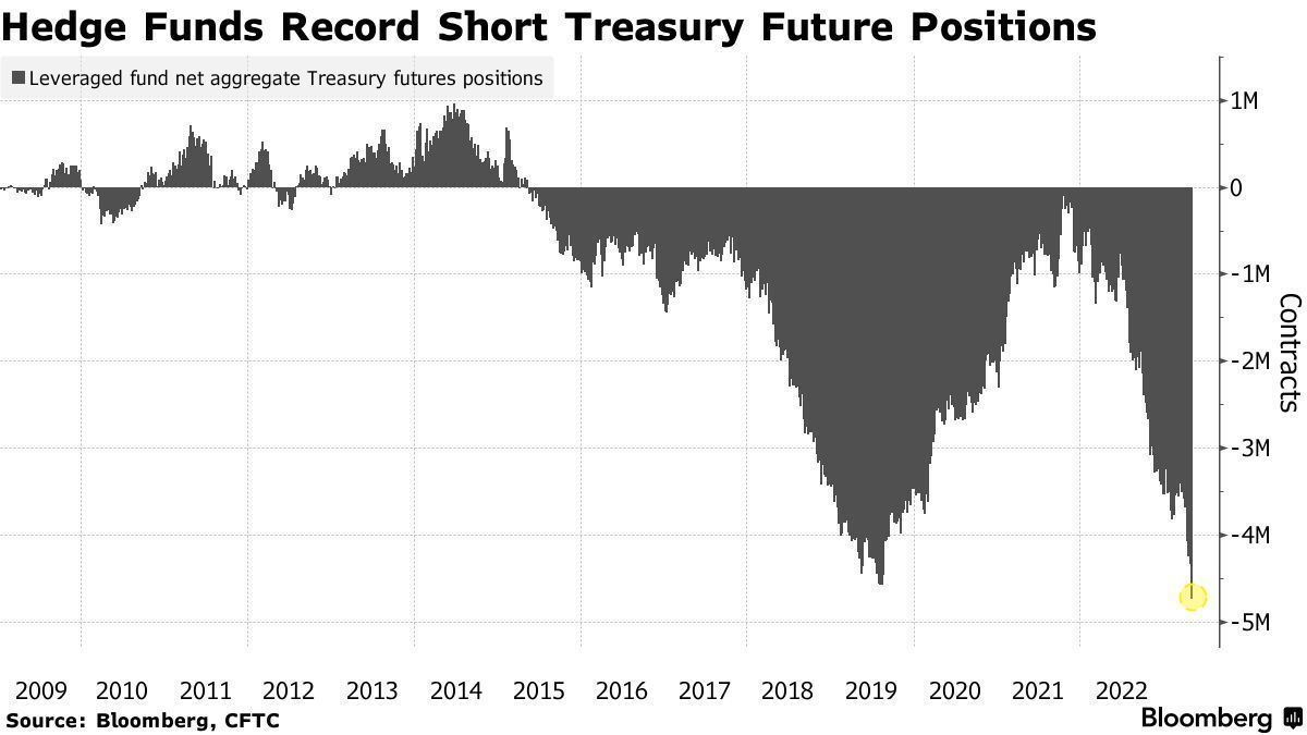根据美国商品期货交易委员会(CFTC)的最新统计数据,杠杆型对冲基金在截至5月2日的一周内,将美国国债期货的整体空头比例推高至创纪录的历史高位。同时这也是对冲基金连续七周对美债的看空押注增加——该项数据创下自2017年以来的最长纪录。