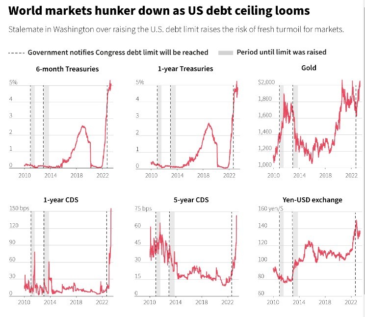 华盛顿两党在提高美国债务上限问题上彻底陷入僵局,增加了金融市场出现剧烈动荡的风险。如果美国政府未能如期支付利息,投资者将纷纷要求于美国潜在债务违约日期前后到期的美债支付更高的收益率溢价,因此全球的美债投资者将大举抛售美债进而不断推高美债收益率,尤其是较短期的美债,这可能正是对冲基金大举抛售美债的重要逻辑。