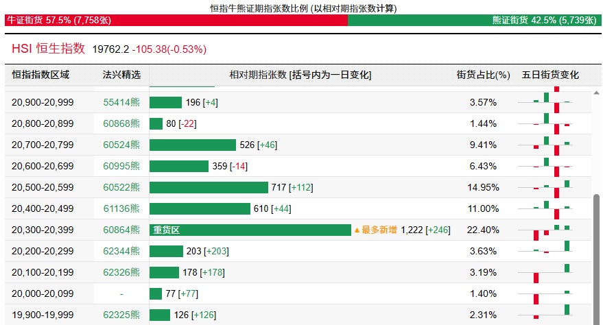 法兴恒指牛熊证街货分布图中的数据显示,熊证街货重货区都在20300-20399区间,该区间最新熊证数量为1222张,较上一交易日增加246张。最多新增在同一区间。