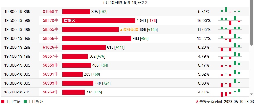 牛证街货重货区在19500-19599区间,该区间最新牛证数量为1041张,较上一交易日减少178张。最多新增在19400-19499区间,较上一交易日增加145张。