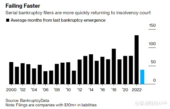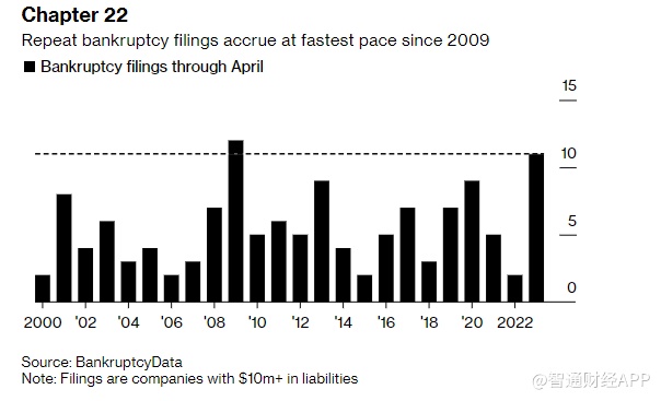 根据BankruptcyData的数据,截至4月份的11起重复破产申请数量已经超过了2021年或2022年的全年破产案数量,而自2000年以来,今年前4个月的第22章破产案数量只有一次被超越。
