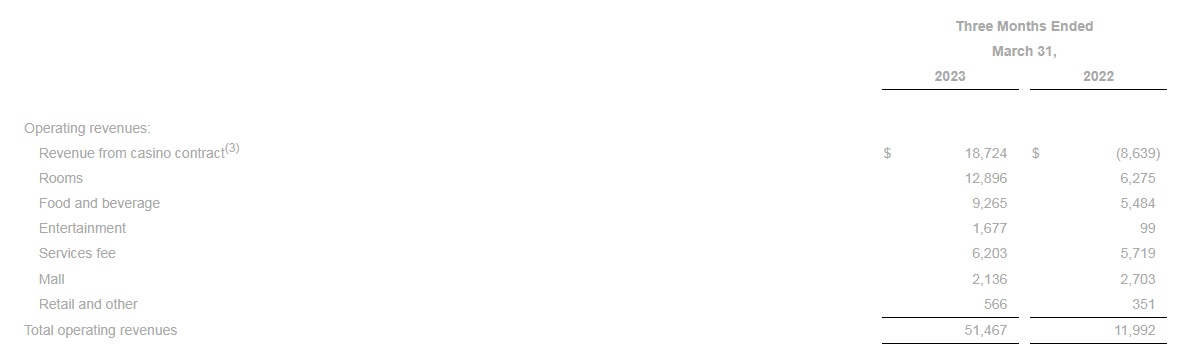 按业务划分,赌场合同营收为1872.4万美元,上年同期为负863.9万美元;酒店住房营收为1289.6万美元,上年同期为627.5万美元;食品及饮料营收为926.5万美元,上年同期为548.4万美元;娱乐营收为167.7万美元,上年同期为9.9万美元;服务费用营收为620.3万美元,上年同期为571.9万美元;商场相关营收为213.6万美元,上年同期为270.3万美元;零售及其他营收为56.6万美元,上年同期为35.1万美元。
