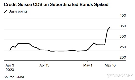 根据CMAI的数据,瑞信CDS本周已跃升85个基点至360个基点,创下自瑞银(UBS.US)在3月同意收购瑞信以来的最大涨幅。作为收购交易的一部分,瑞士监管机构将约170亿美元的瑞信AT1债券全额减记。