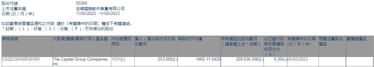 智通财经APP获悉,香港联交所最新资料显示,5月5日,美国资本集团增持金蝶国际(00268)25.3万股,每股作价11.842港元,总金额约为299.6万港元。增持后最新持股数目约为2.09亿股,最新持股比例为6.00%。