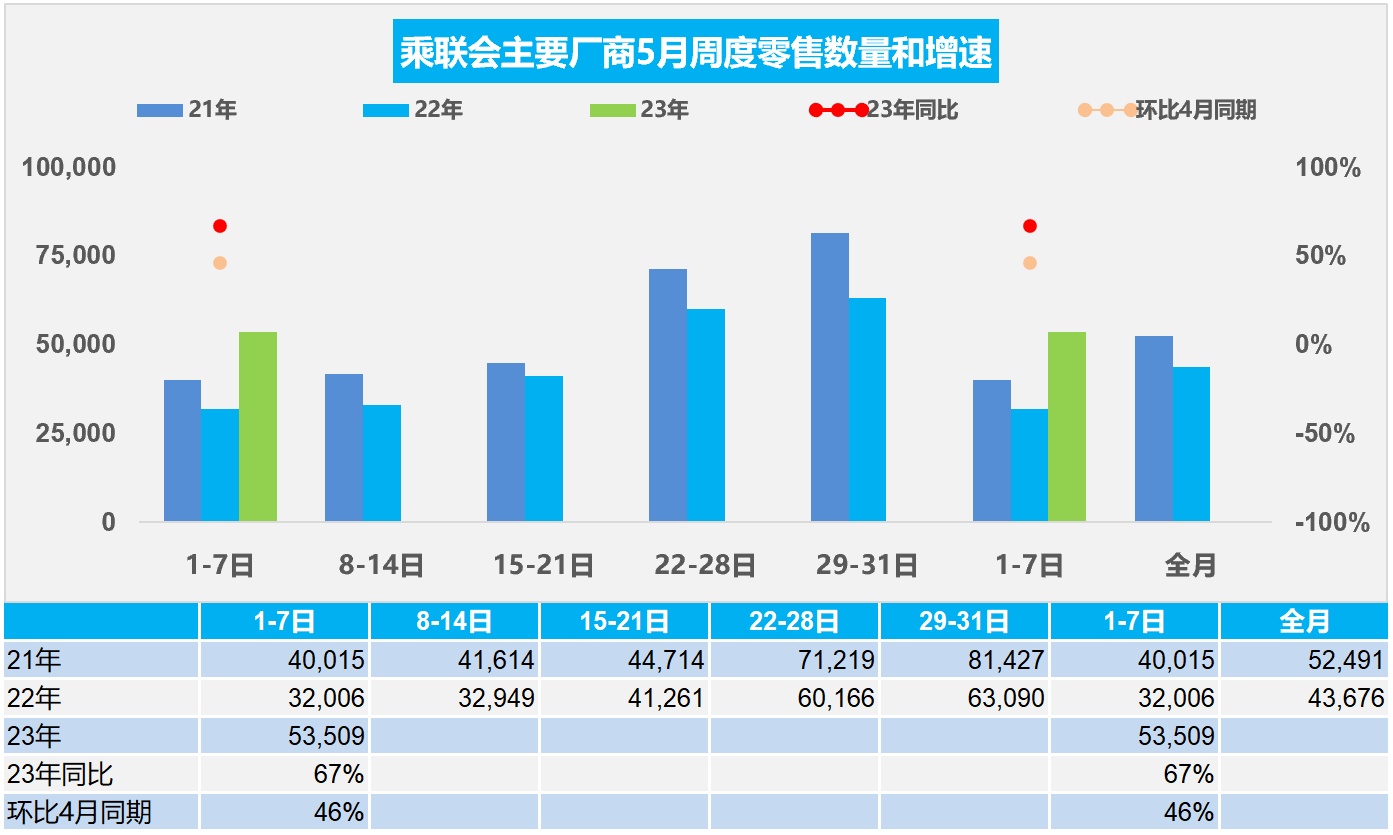 5月第一周全国乘用车市场零售日均5.4万辆,同比去年5月同期增长67%,环比上月同期增长46%。