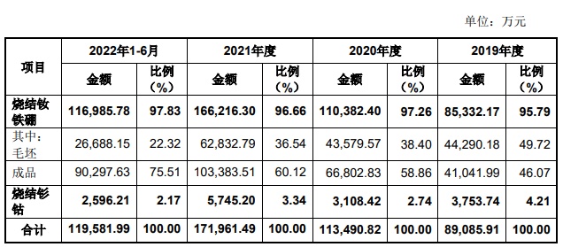 报告期内(报告期指2020年度、2021年度和2022年度),公司主营业务收入主要来自烧结钕铁硼及烧结钐钴产品,具体构成情况如下表所示: