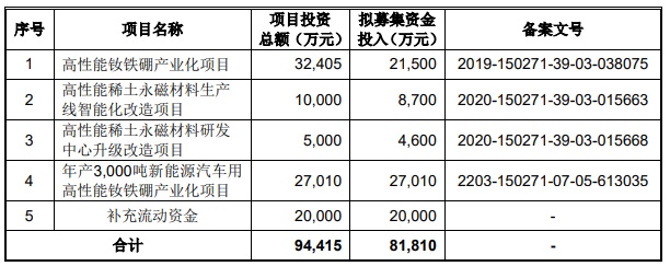 此外,天和磁材本次募集资金主要用于投资如下项目: