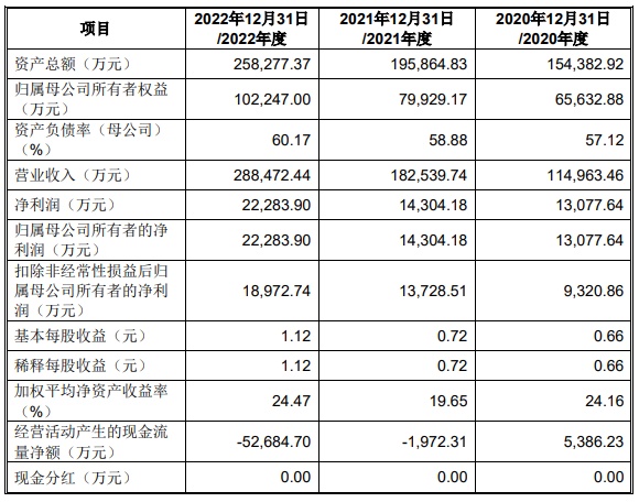 财务方面,公司经营似乎面临较大压力。2020年、2021年、2022年,天和磁材实现营业收入分别约为11.50亿元、18.25亿元、28.85亿元,同期实现归属于母公司所有者的净利润分别约为1.31亿元、1.43亿元、2.23亿元。